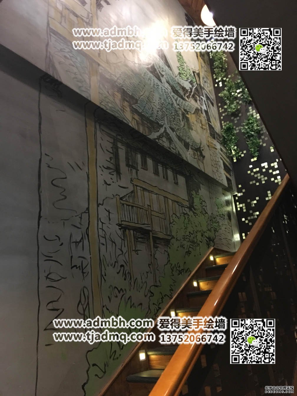 為天津東麗湖蘿蘿貴州火鍋店畫的天津手繪墻畫,畫一些貴州地方風(fēng)格特色建筑的圖案,最后畫一個(gè)貴州地圖。